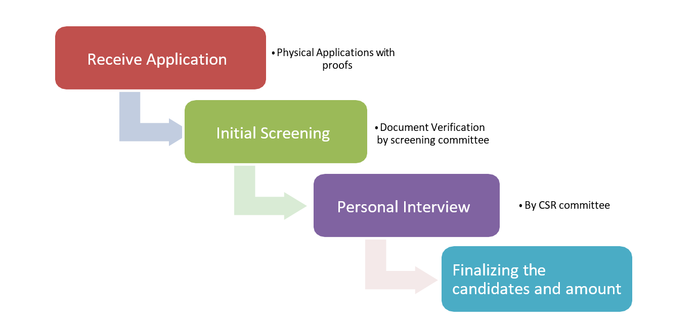 This committee will screen the total applications received. The document verification and family income verification and physical verification will be done by this committee. Applications fitting all the criteria will be shortlisted for personal interview with CSR committee. The committee members are