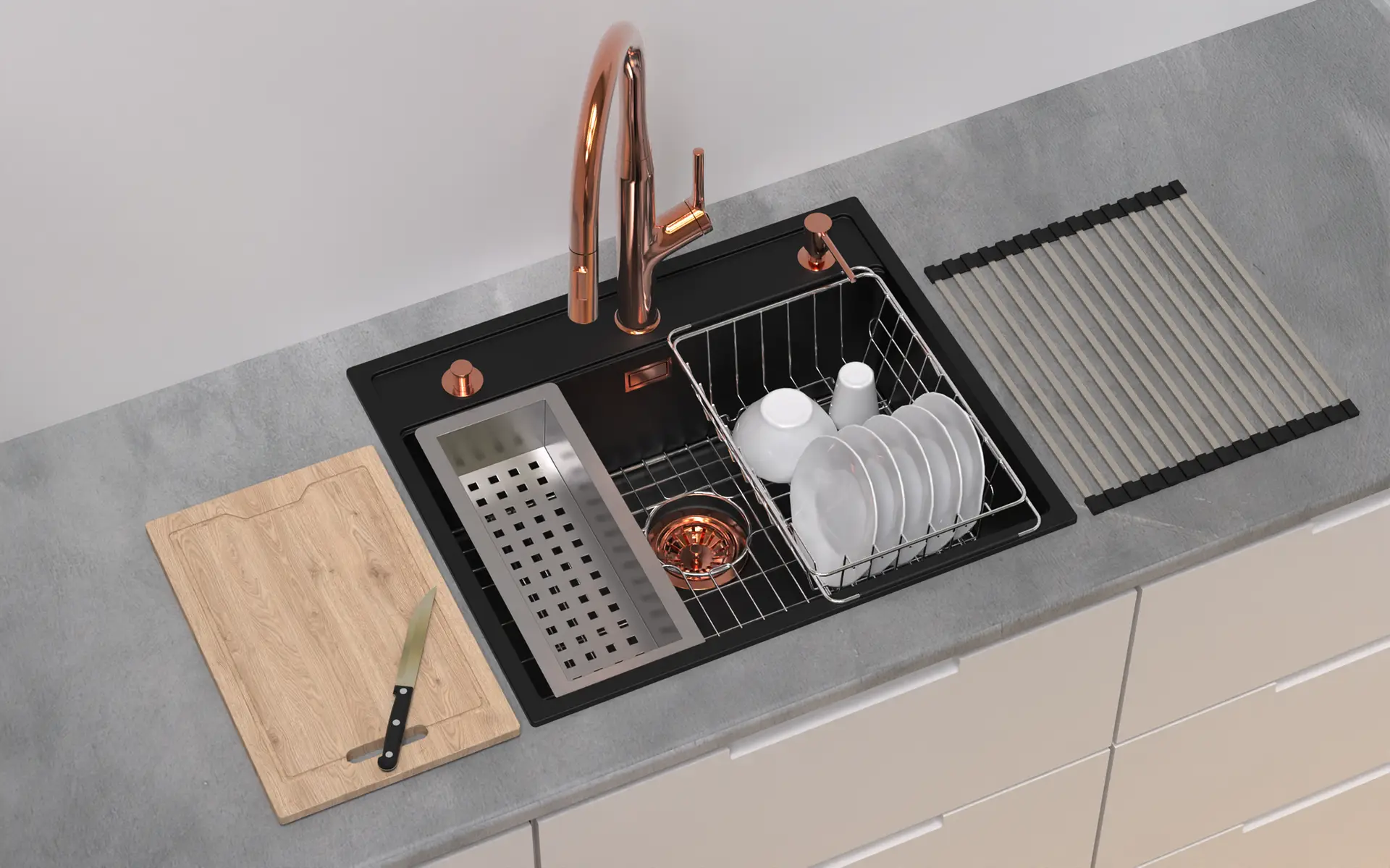 Carysil sink accessories make everyday prep easier. With smart add-ons like the colander, chopping board, glass rinser, and more, everything stays in place and within reach—turning your sink into a streamlined prep zone and your kitchen into the most efficient spot in the home. Available in multiple finishes to complement your kitchen sink space.