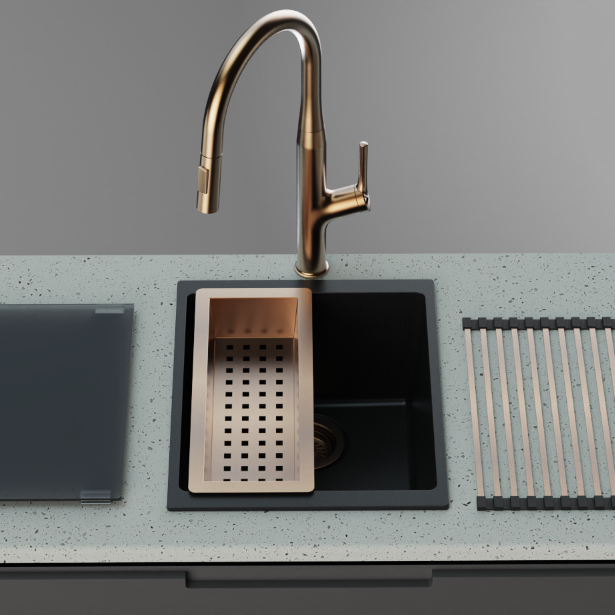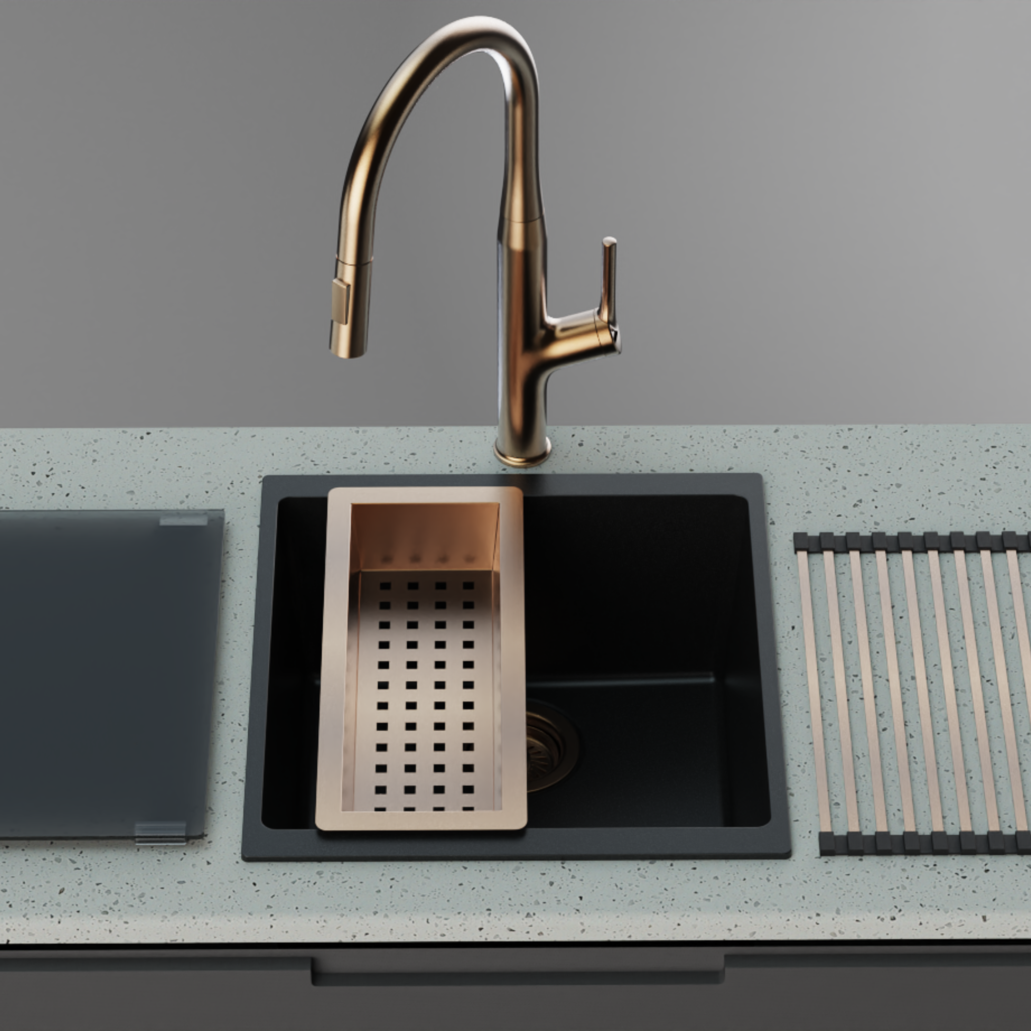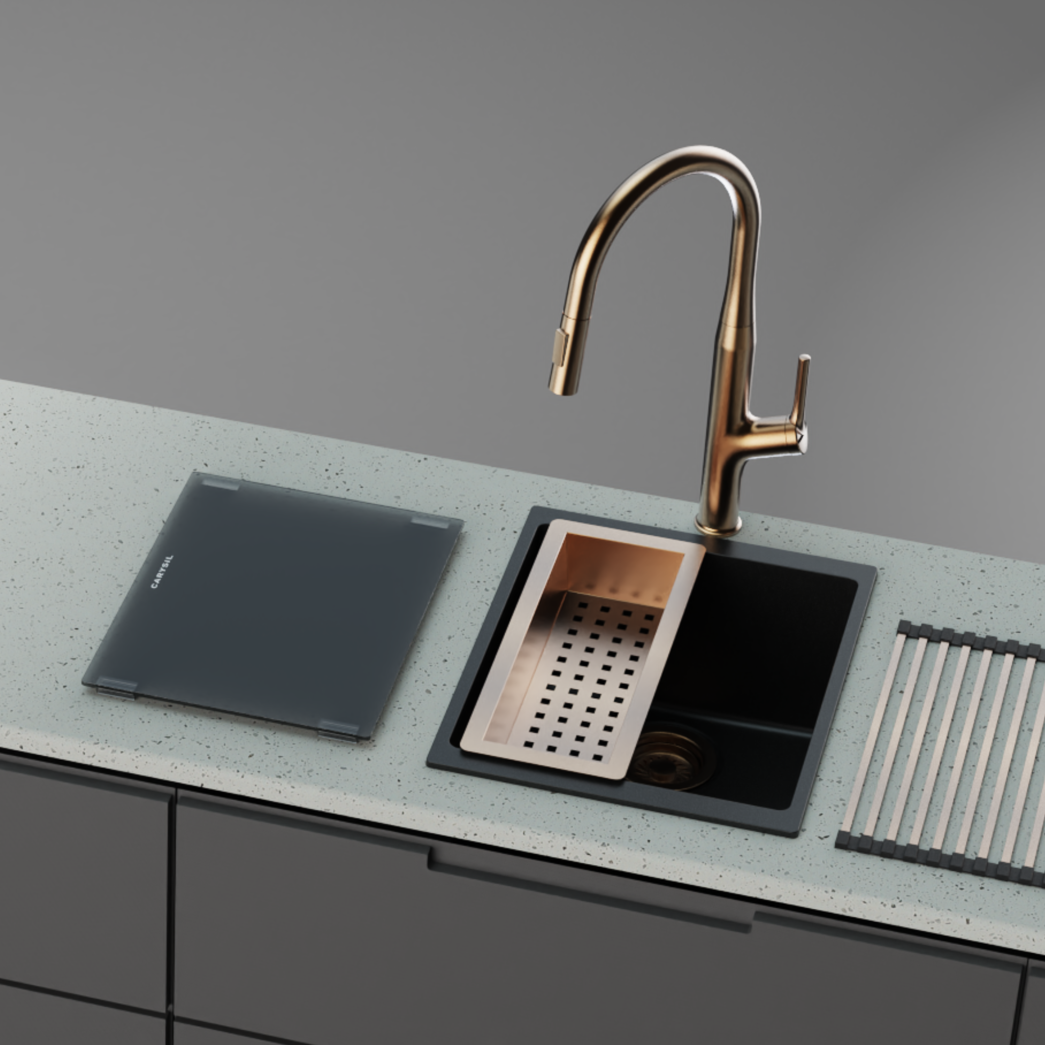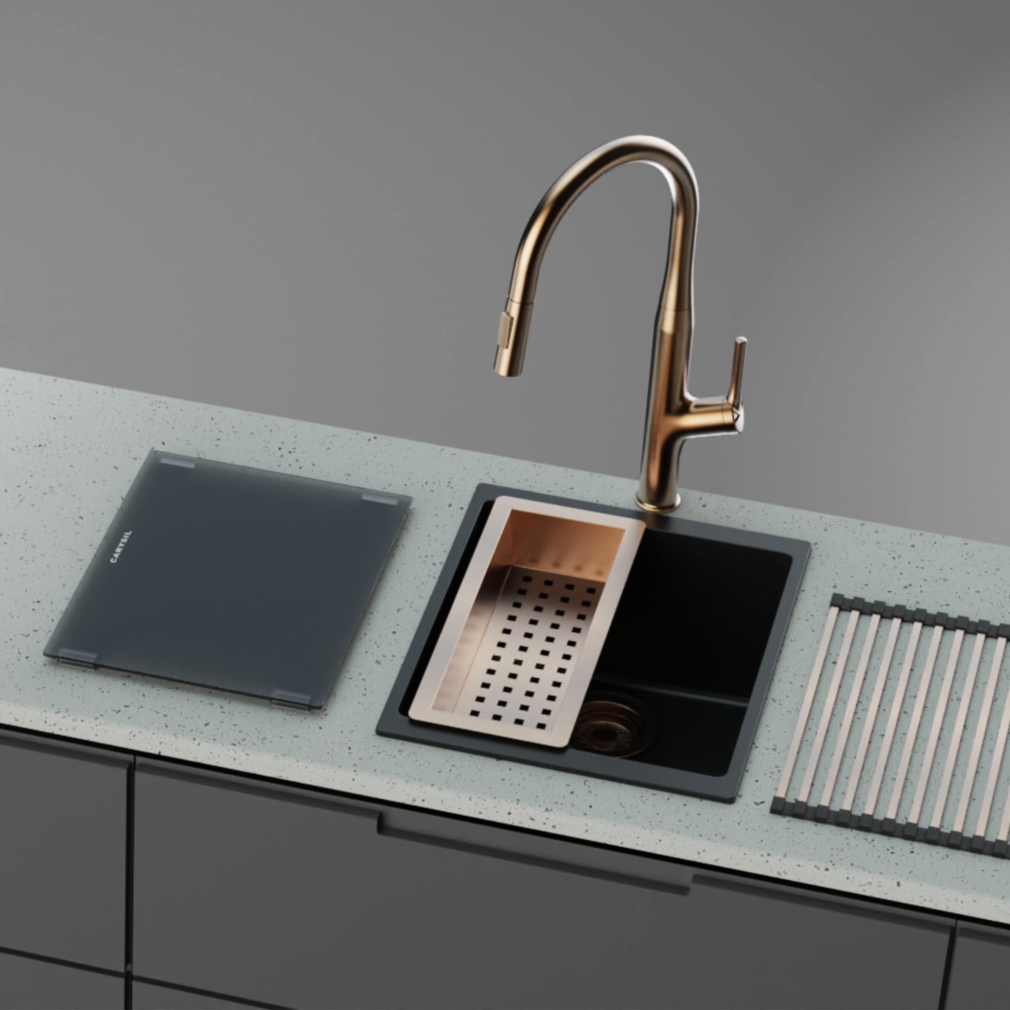 Carysil quartz sinks are crafted from a blend of 80% natural quartz and 20% acrylic resin, ensuring strength and a refined finish.