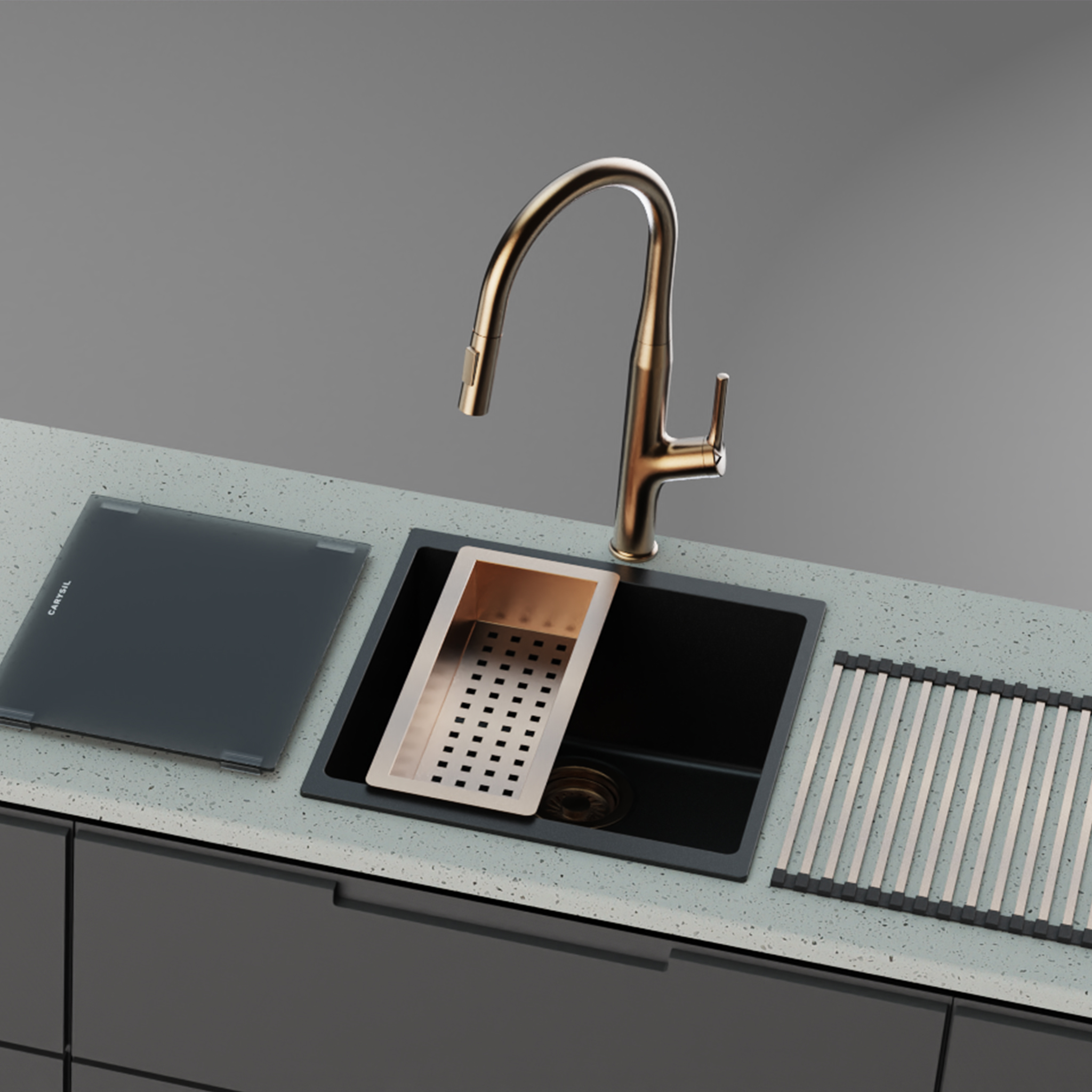 Carysil quartz sinks are crafted from a blend of 80% natural quartz and 20% acrylic resin, ensuring strength and a refined finish.