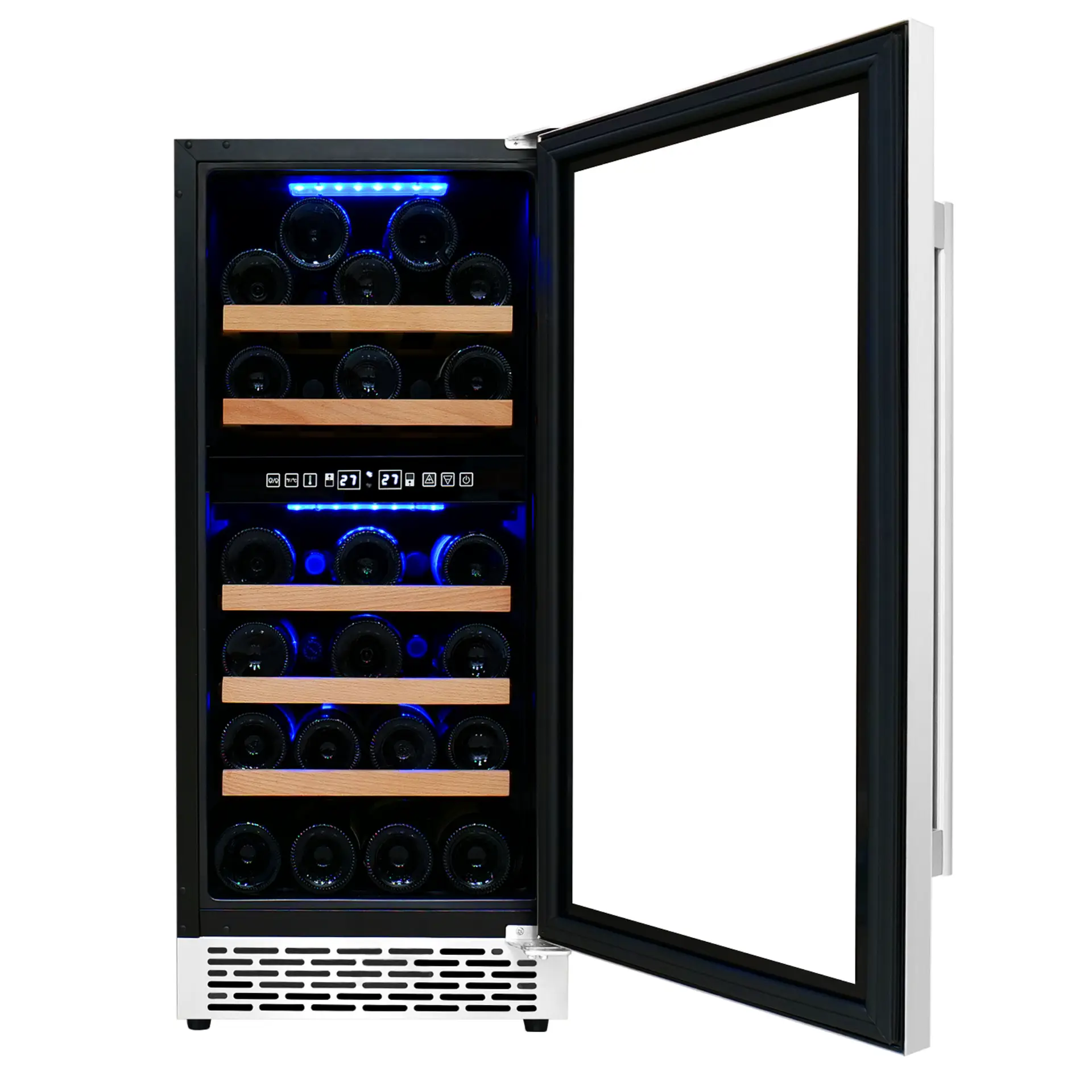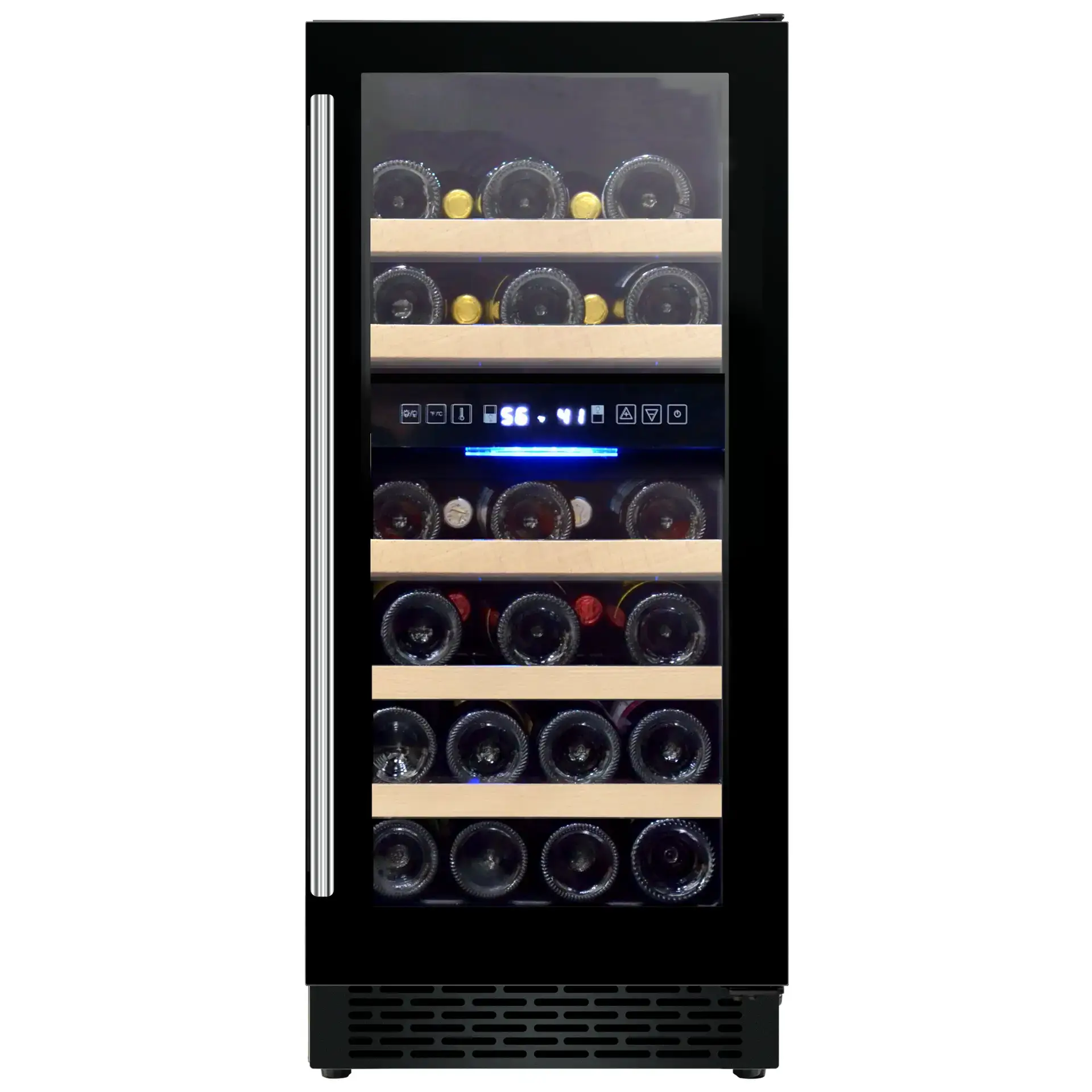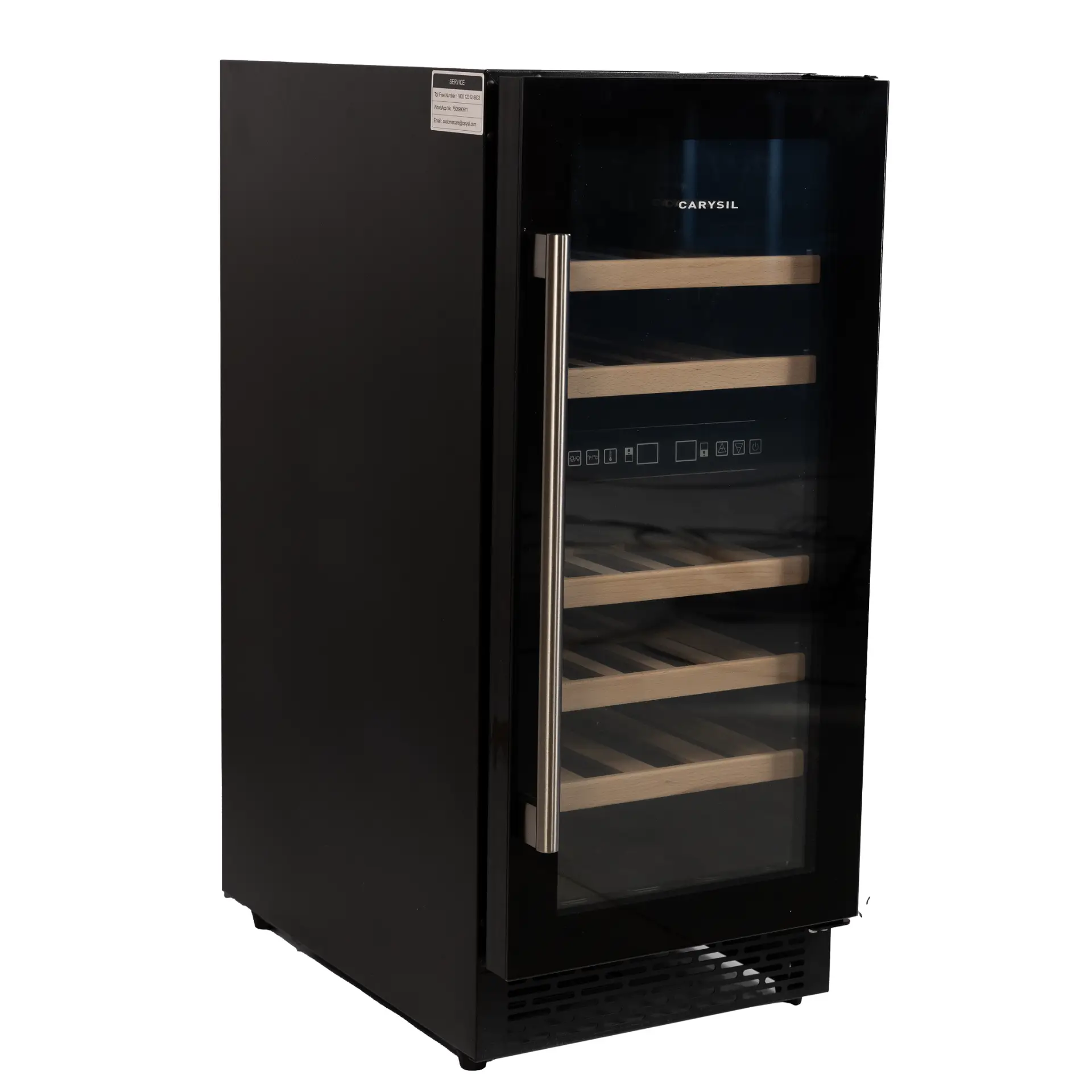 Designed for wine collectors, this 31 bottle wine chiller unit combines capacity with compactness. Adjustable wooden shelves and touch control panel allow for effortless storage and precise settings.