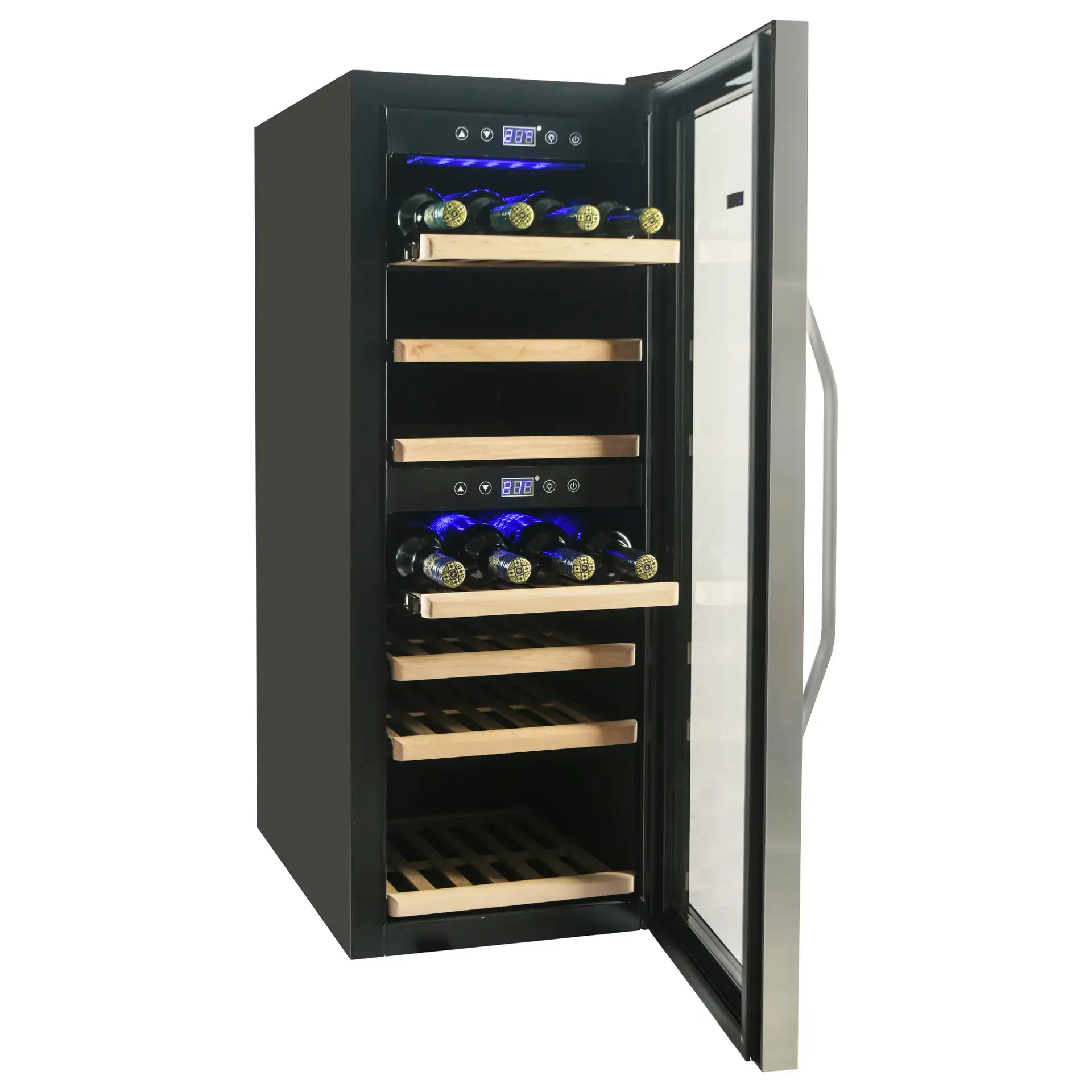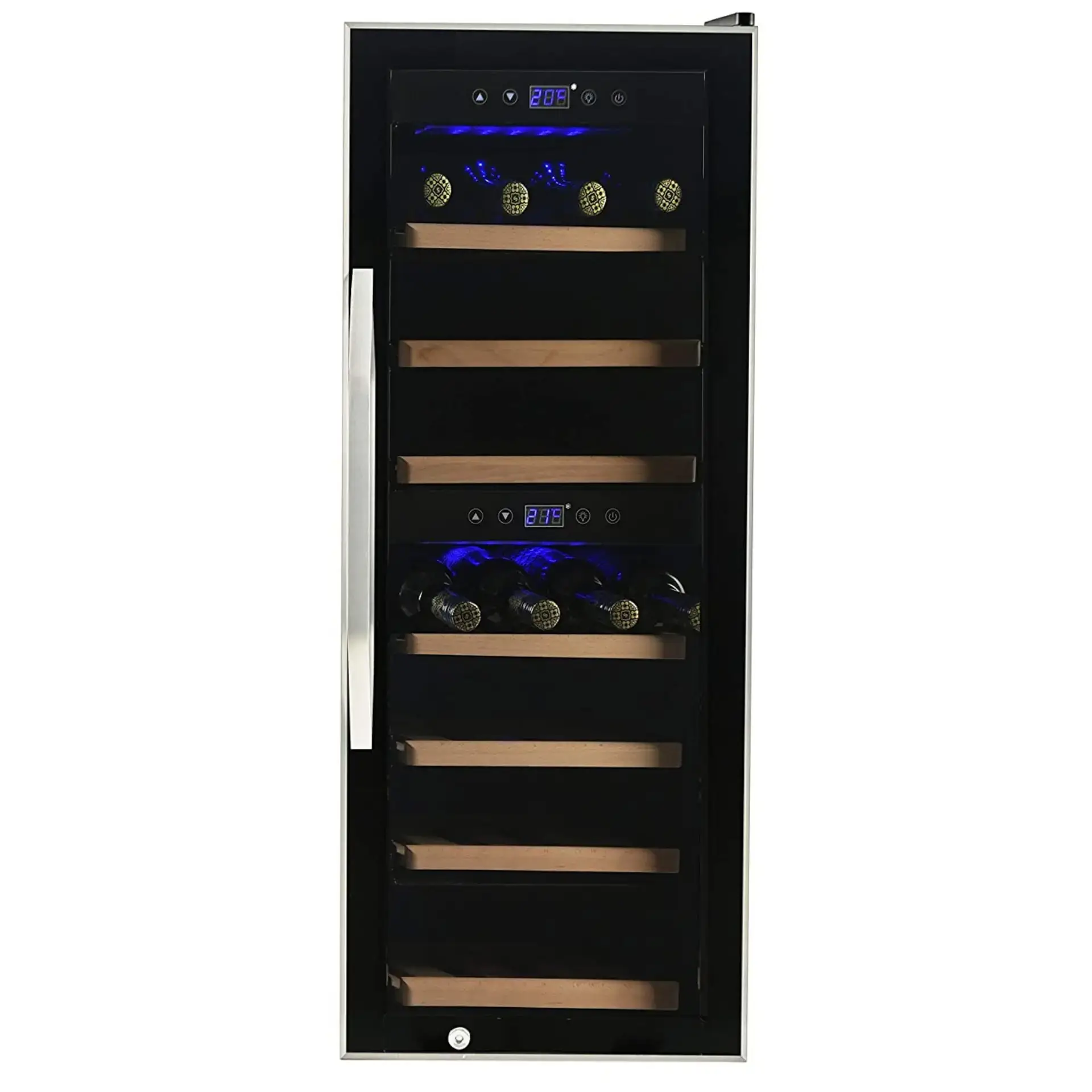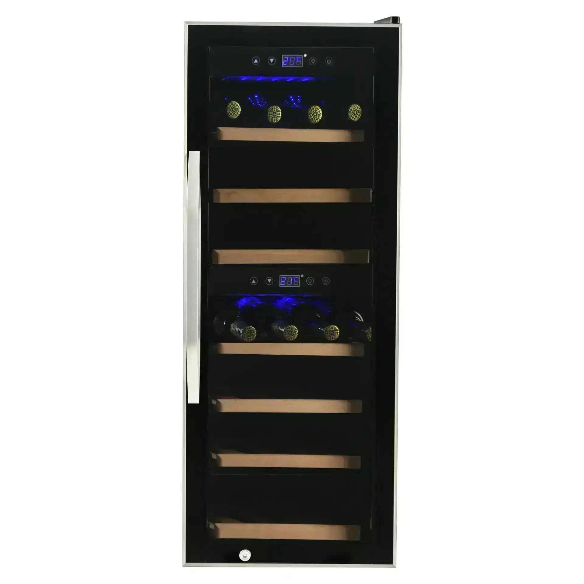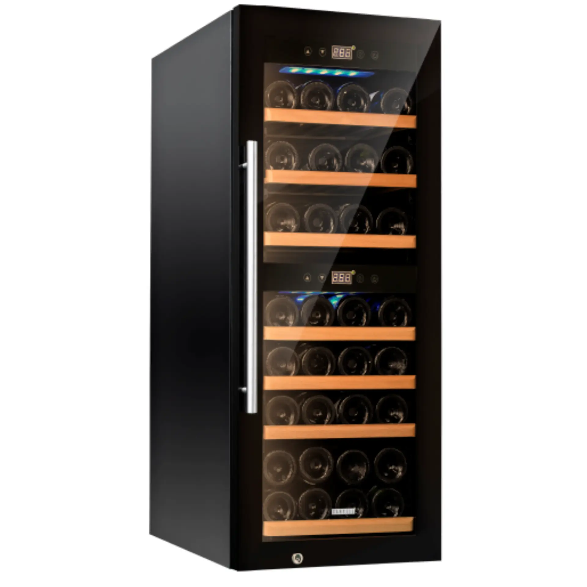 With dual temperature zones and ample storage, this 38-bottle wine chiller caters to wine enthusiasts who prefer variety. Its anti-UV glass door and quiet cooling keep your collection in pristine condition.
